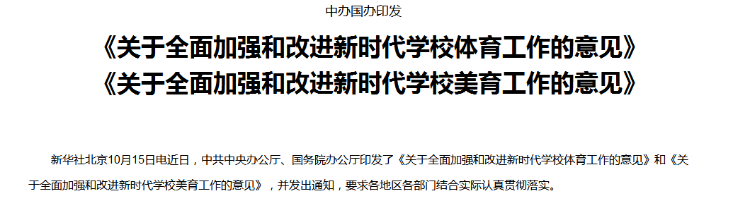 2020年10月15日,中共中央办公厅、国务院办公厅印发了《关于全面加强和改进新时代学校美育工作的意见》,意见中强调了美是纯洁道德、丰富精神的重要源泉。美育是审美教育、情操教育、心灵教育,也是丰富想象力和培养创新意识的教育,能提升审美素养、陶冶情操、温润心灵、激发创新创造活力。